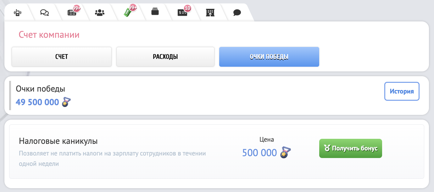 Чтобы потратить Очки победы с максимальной пользой для Вашего таксопарка, перейдите на страницу состояния её счёта. В настоящее время на Очки победы доступнен бонус Налоговые каникулы.