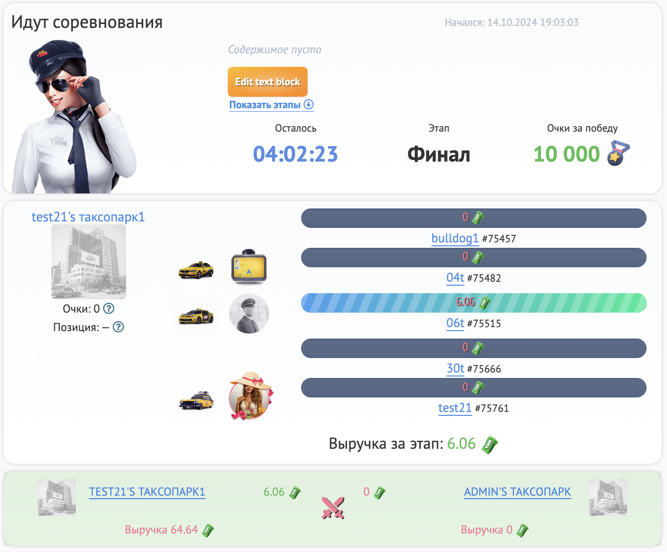 • Прокачивать Ваш Таксопарк/Горную компанию. В турнирах участвуют компании всех рангов, а значит шансы на победу у компаний с более высокими рангами выше, чем у остальных, так как у них в штате находятся сотрудники с техникой, которая зарабатывает больше.