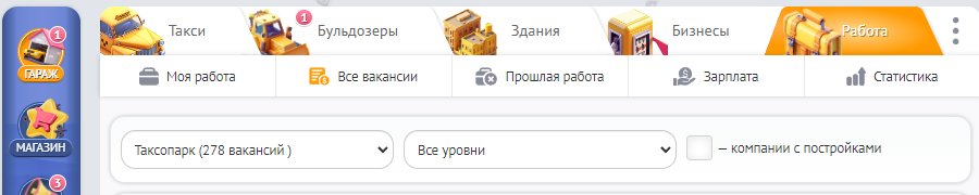 Посмотрите на доступные вакансии, подберите себе подходящую по уровню навыков, зарплаты и техники, затем смело откликнетесь! Возможно вы именно тот, кого ищет компания! Сделать это можно в гараже, на вкладке «работа».
