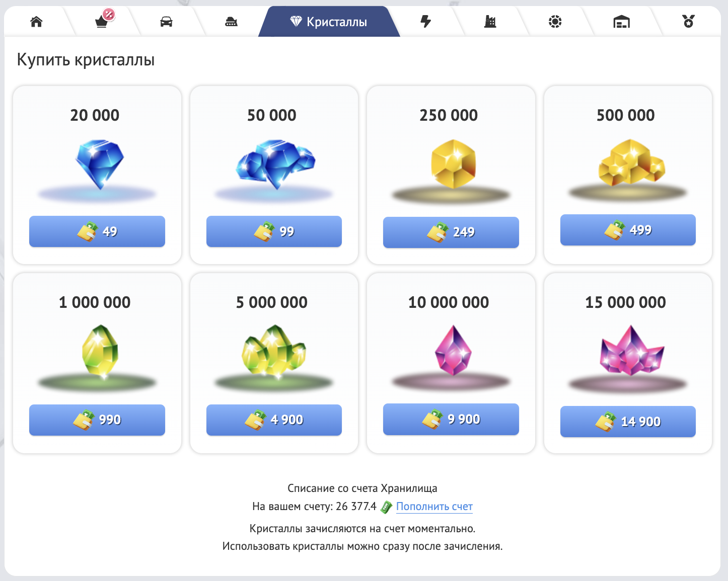 Кристаллы можно купить в разделе Кристаллы в Магазине или получить за выполнение заказов. Кристаллы зачисляются на счет сразу.