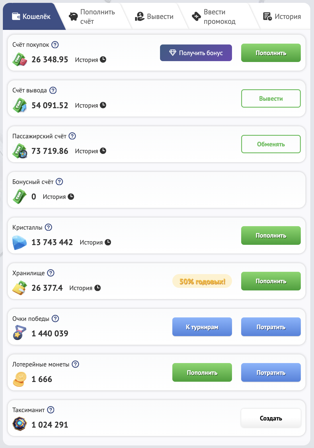 В игре есть несколько видов счетов, имеющих разное назначение: