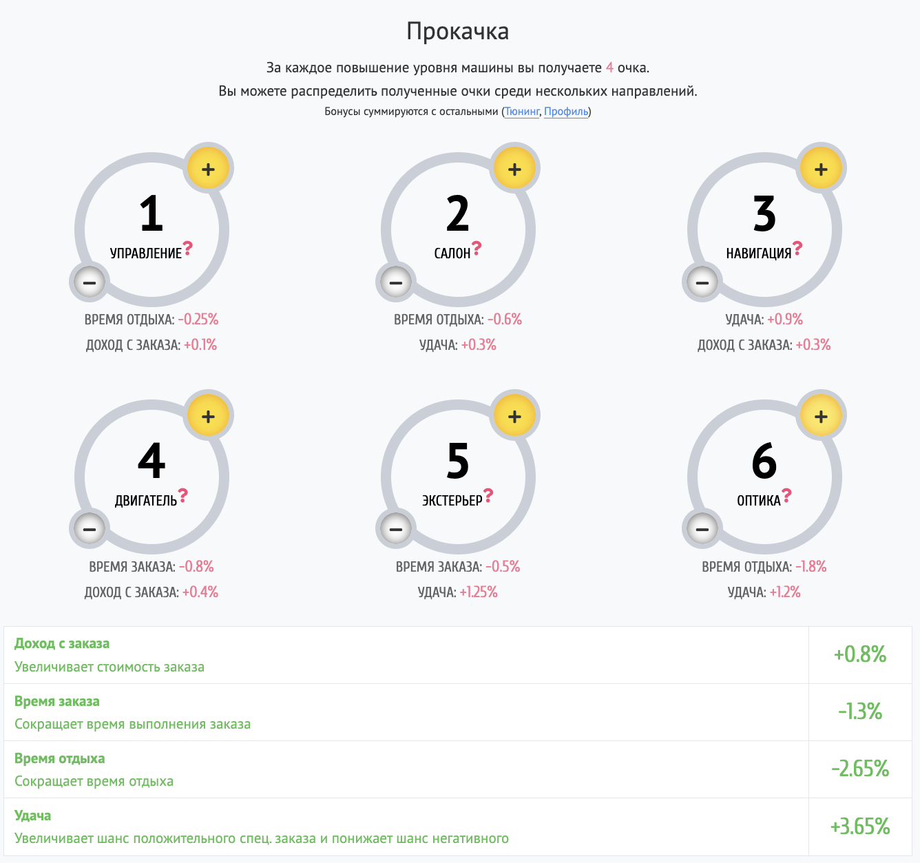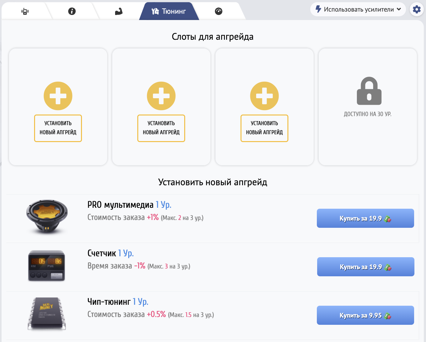 Стоимость апгрейдов зависит от уровня такси и уровня прокачки. Чем выше уровень такси, тем выше стоимость и выше отдача от установленного улучшения.