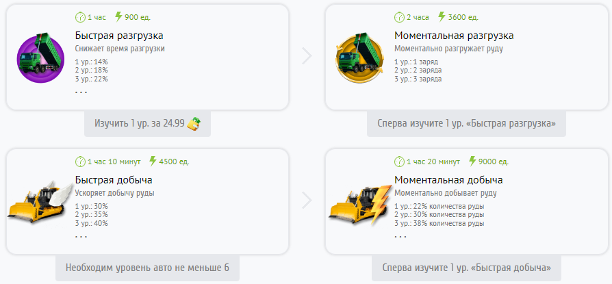 Способности бульдозеров позволяют сокращать время добычи и разгрузки, а также увеличить количество добываемой руды. Изучайте способности на каждом из Ваших бульдозеров, чтобы добиться максимальных результатов в игре!