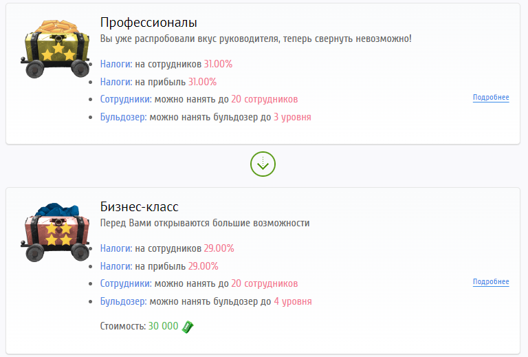 Далее для перехода на следующий уровень — если компания выполнила все необходимые условия — нажмите на кнопку «Перейти на следующий этап». Стоимость перехода будет списана с основного счёта Вашей горной компании.