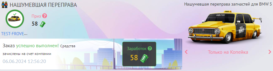 В случае успешного выполнения командного заказа, соответствующая сумма зачисляется на счёт таксопарка, игроки которого выполнили заказ.