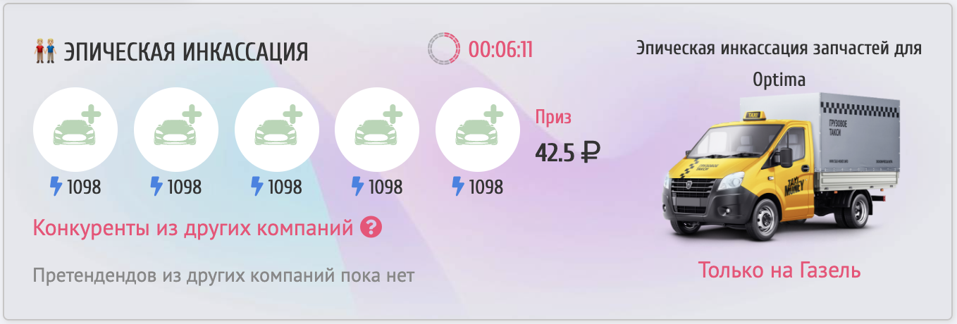 Выполнять заказ отправляется только одна команда игроков — та, которая смогла собрать необходимое количество указанных такси раньше конкурентов. Другие таксопарки остаются ждать появления следующих командных заказов.