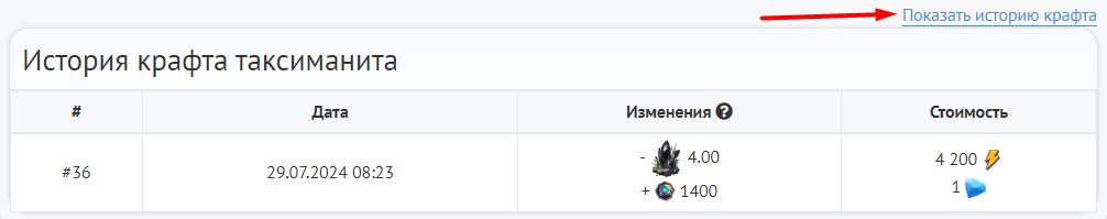 Чтобы посмотреть истоию крафта таксиманита, необходимо нажать на "Показать историю крафта"