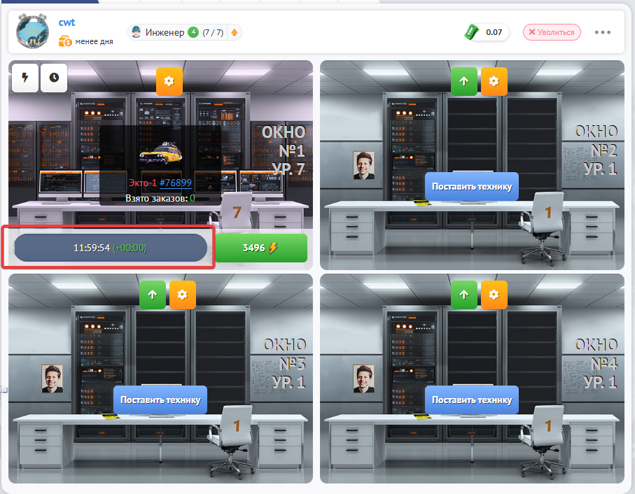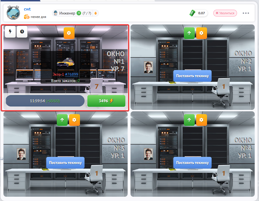 В Дата центре есть 4 рабочих окна, в каждом из которых может обслуживаться одна единица техники.