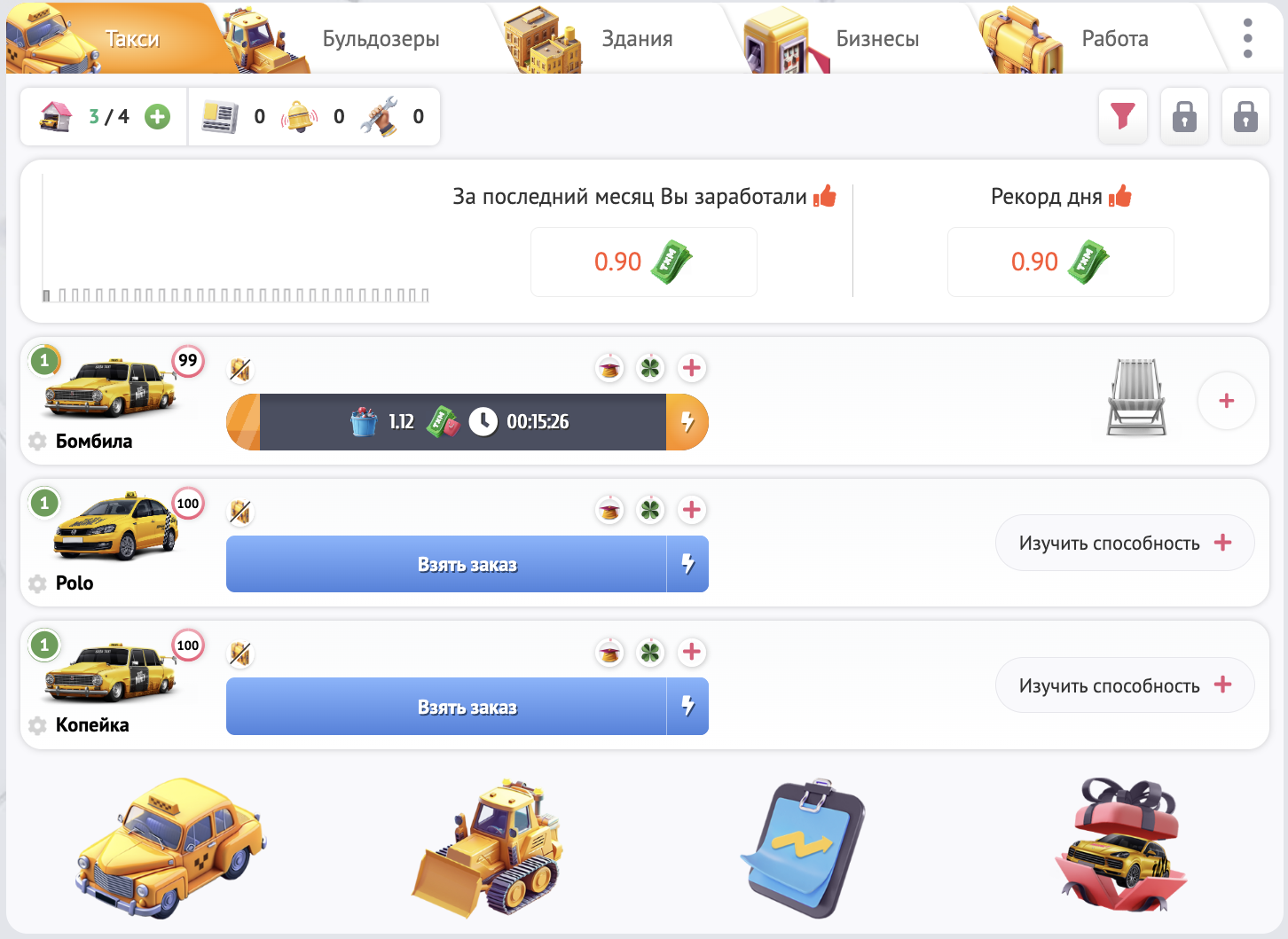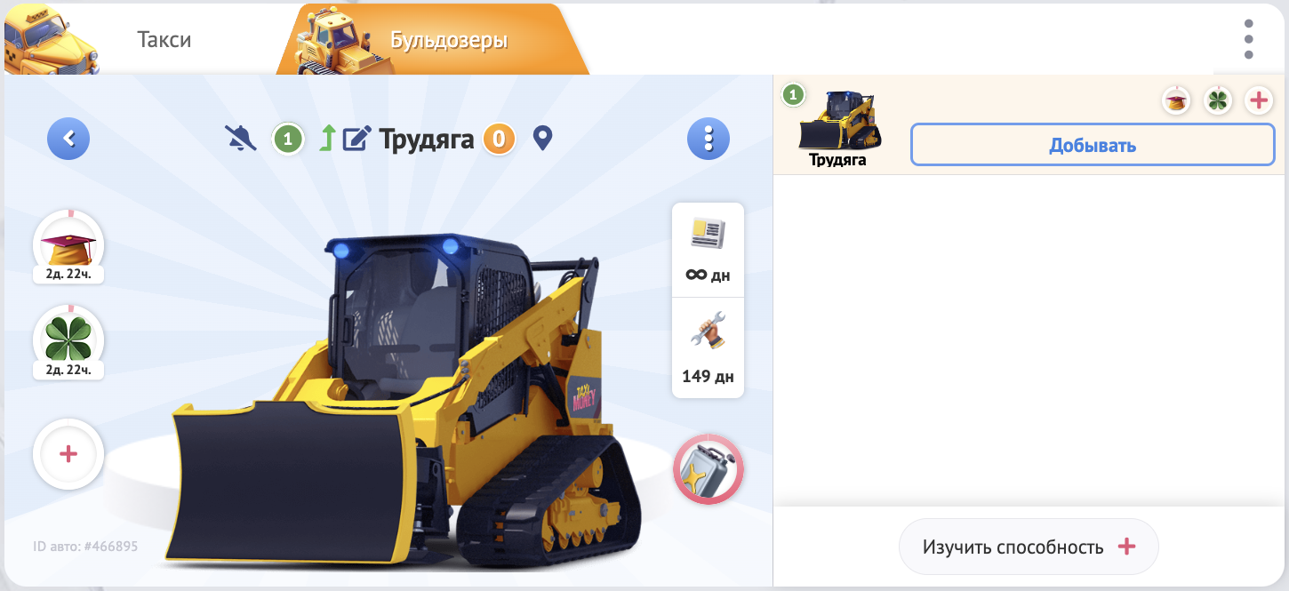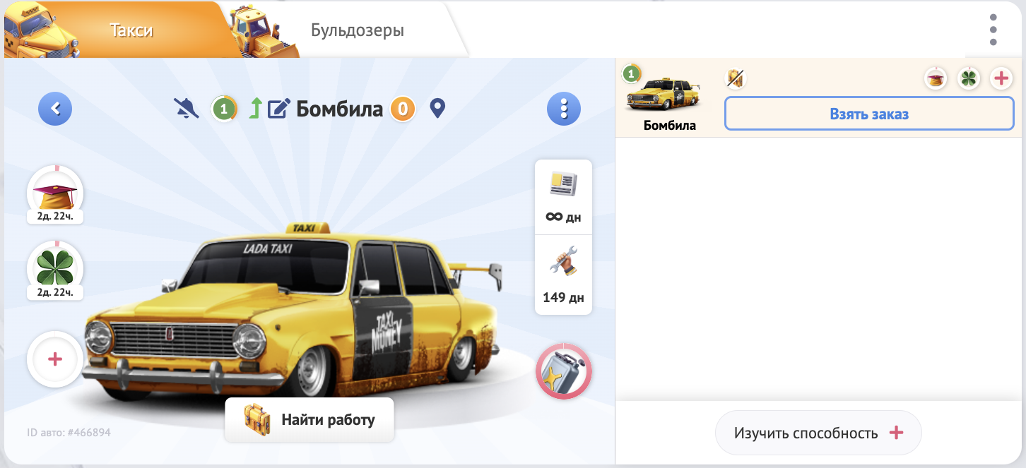 Несмотря на то, что это демонстрационные такси и бульдозер, Вы можете спокойно брать заказы, ставить апгрейды, прокачивать свой уровень и уровень техники.