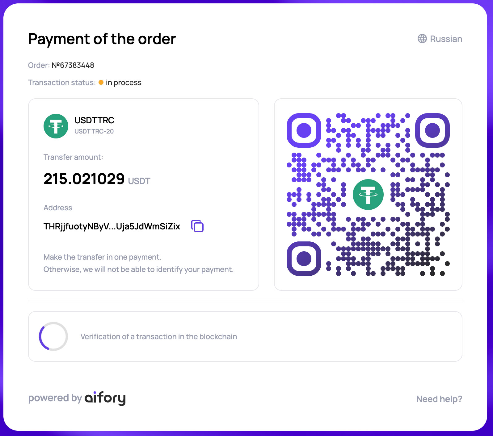 2. Далее финансовый провайдер сформирует для Вас точную сумму в выбранной криптовалюте и адрес разового кошелька для оплаты.