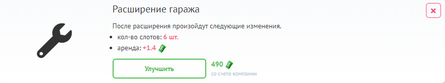 Вы можете расширить гараж вашего автосервиса, что даст возможность открыть три дополнительных бокса. Всего может быть максимум 9 боксов.