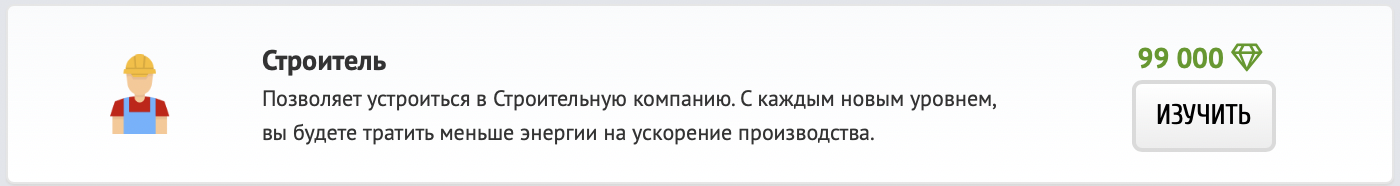 Изучите навык «Строитель», и устройтесь на работу в одну из строительных компаний! С каждым новым уровнем Вы будете тратить меньше энергии на стройке.