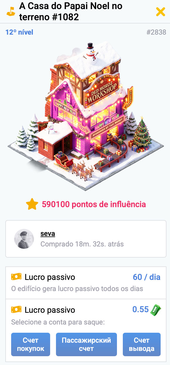 Cada upgrade de nível do edifício custa apenas 1000 ! E no nível 12, a Casa do Papai Noel trará a você renda passiva de até 60 por dia!