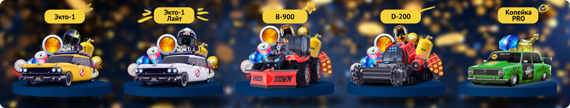 Помимо такси Экто-1, Экто-1 Лайт и бульдозера B-900 игра подарит тебе Копейку, Копейку PRO, Polo или Optima + кэшбек в подарок за депозиты на соответствующие суммы.
