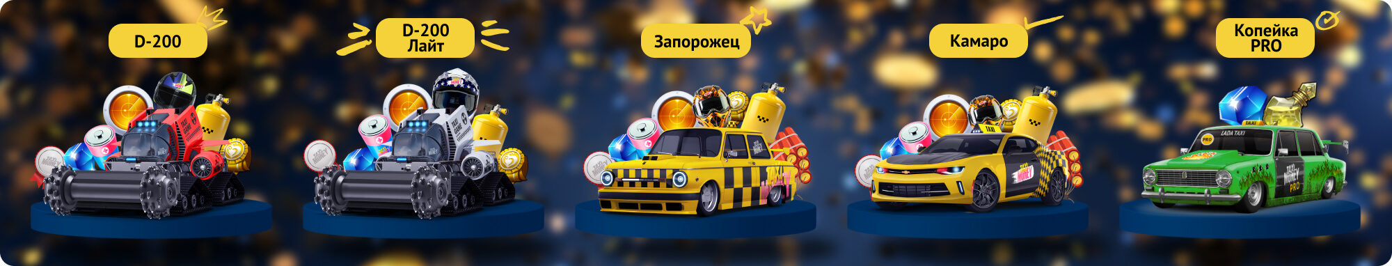 Выиграй топовое такси или бульдозер для заработка всего от 49! В июле 2024 в лотереях с монетами участвуют такси Камаро, Камаро Лайт и Копейка PRO а также бульдозеры B-888 и D-100!